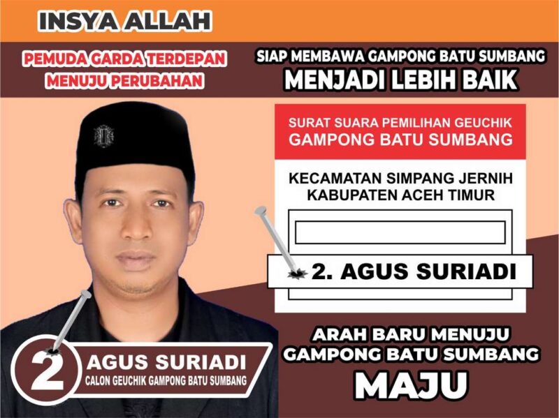 Aceh Timur – Dari sebuah desa di hulu Kecamatan Simpang Jernih, suara perubahan perlahan-lahan mulai terdengar. Desa Batu Sumbang, yang selama ini nyaris luput dari perhatian media dan kebijakan besar kabupaten, kini tengah bersiap menyambut momentum enam tahunan: pemilihan Geuchik. Dalam hiruk pikuk pesta demokrasi lokal itu, satu nama mengemuka—Agus Suryadi. Bukan sekadar kandidat, tetapi pembawa gagasan yang mencoba mendefinisikan ulang peran seorang kepala desa di tengah realitas sosial yang kompleks.