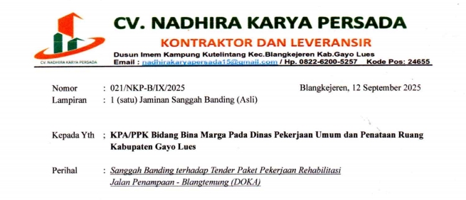 ACEH | Blangkejeren, Drama pengadaan proyek jalan di Kabupaten Gayo Lues kembali pecah. Tender rehabilitasi Jalan Penampaan – Blang Temung (DOKA) yang digelar Pokja III UKPBJ Gayo Lues kini resmi digugat lewat sanggahan banding oleh CV. Nadhira Karya Persada, perusahaan lokal yang menolak tunduk pada keputusan panitia.