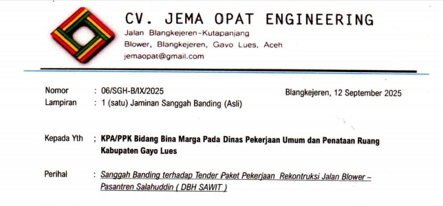 Surat sanggah banding bernomor 06⁴/SGH-B/IX/2025 yang ditandatangani langsung oleh Direktur CV. Jema Opat Engineering, Muhammad Isnaini, ditujukan kepada KPA/PPK bidang Bina Marga pada Dinas PUPR Kabupaten Gayo Lues.