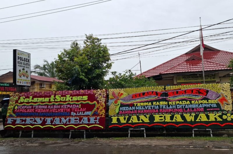 Sebagai bentuk ungkapan terima kasih, masyarakat mengirimkan karangan bunga ucapan selamat dan apresiasi yang dipajang berjajar di depan Mapolsek Medan Helvetia, Selass (21/10/2025).