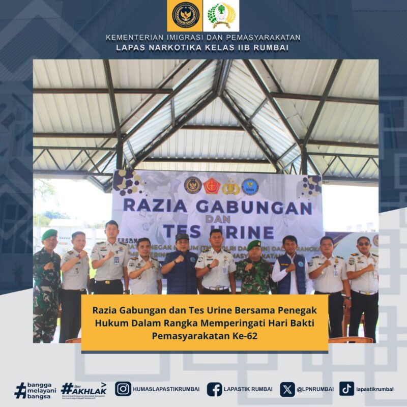 Pekanbaru – Dalam rangka memperingati Hari Bakti Pemasyarakatan ke-62, Lembaga Pemasyarakatan Narkotika Kelas IIB Rumbai melaksanakan kegiatan razia gabungan dan tes urine yang melibatkan aparat penegak hukum pada Kamis, 16 April 2026.